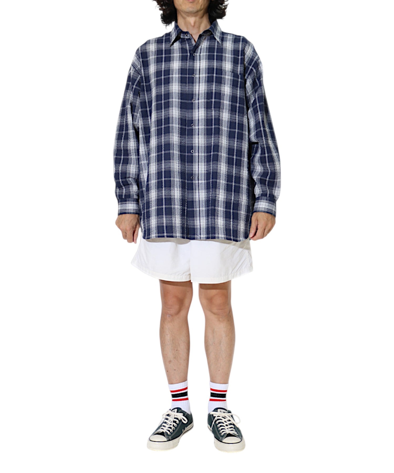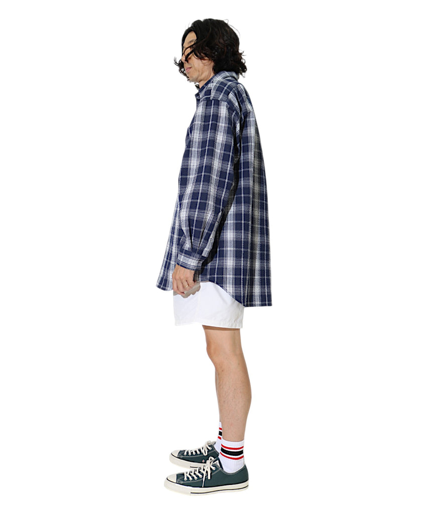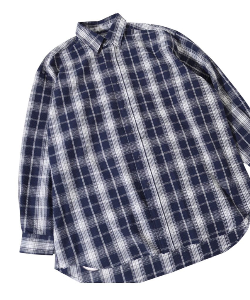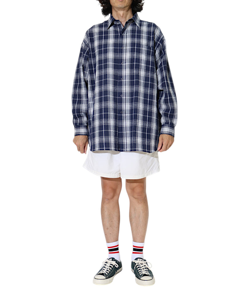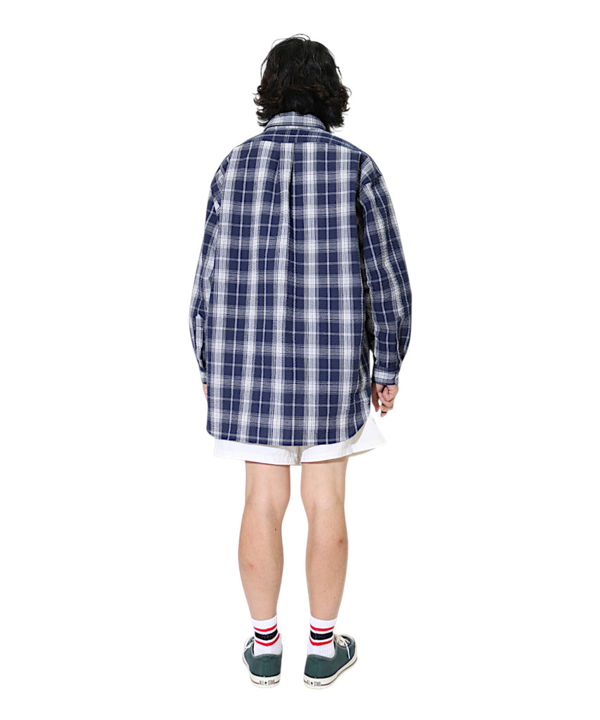 定番商品のロングスリーブB.B.シャツです。春夏シーズンにちょうどいいコットン55%、ポリエステル45%の肌触りのいい軽量なシアサッカー素材を使用しました。表面に波のような凹凸があるので、肌離れがよく通気性が高い為、着心地が良く、真夏の冷房が効いた場所での羽織りアイテムとしても重宝しそうです。プレイド柄のプリントが大人アメトラスタイルにどハマりしそうですね。